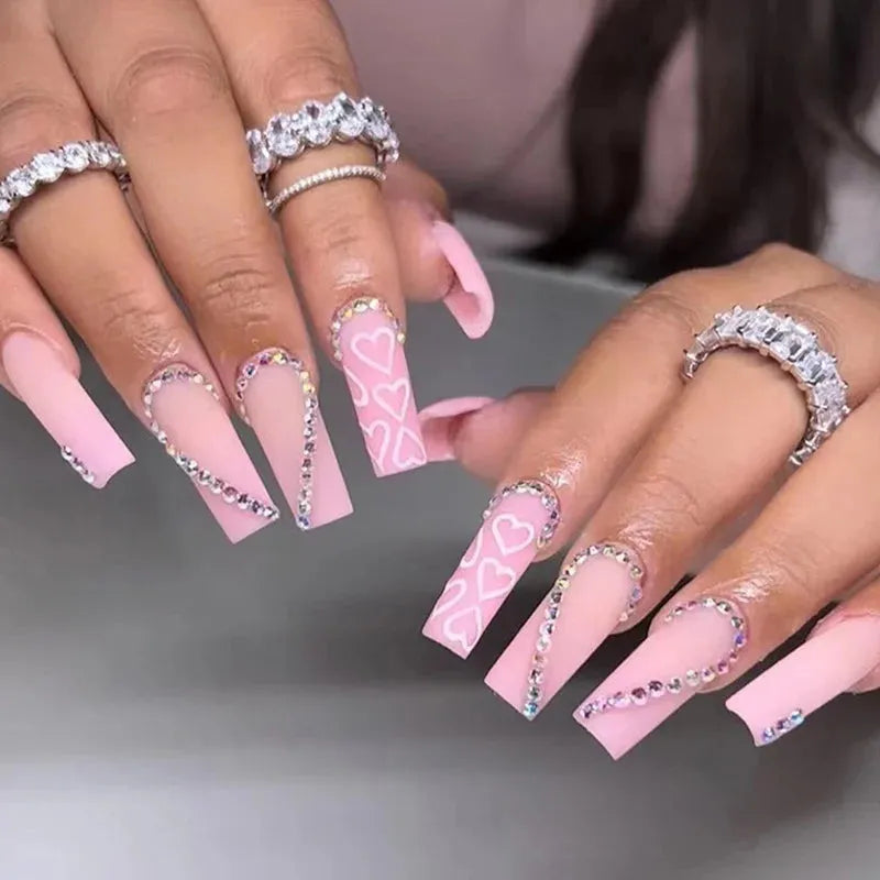 24Pcs/Box Pink French False Nails With jelly Glue rhinestone Fake Nail Tips Detachable Acrylic Coffin Bow Press On Nails